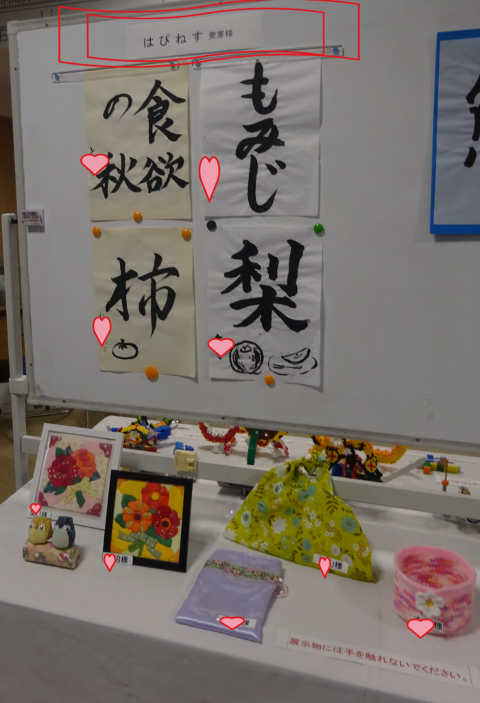 はぴねす発寒からも今回初めて手作りの手芸や書道の作品を出品させて頂きました。