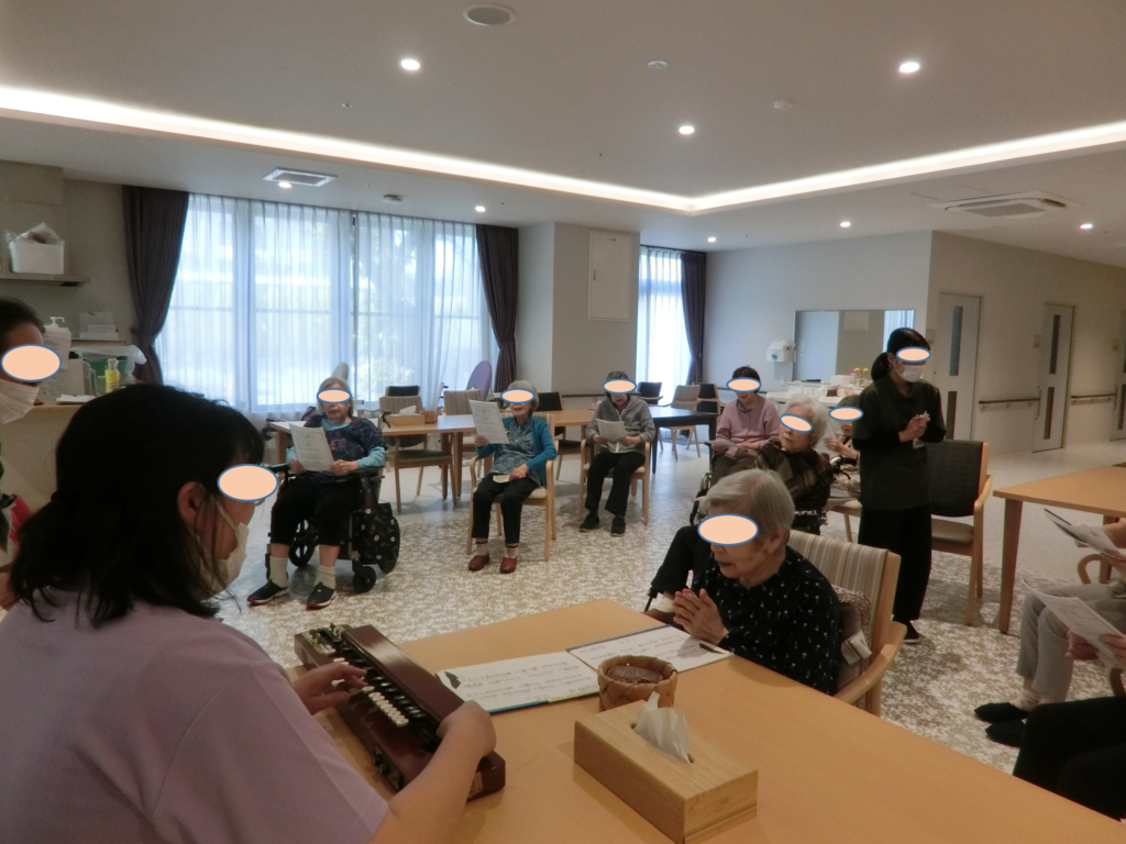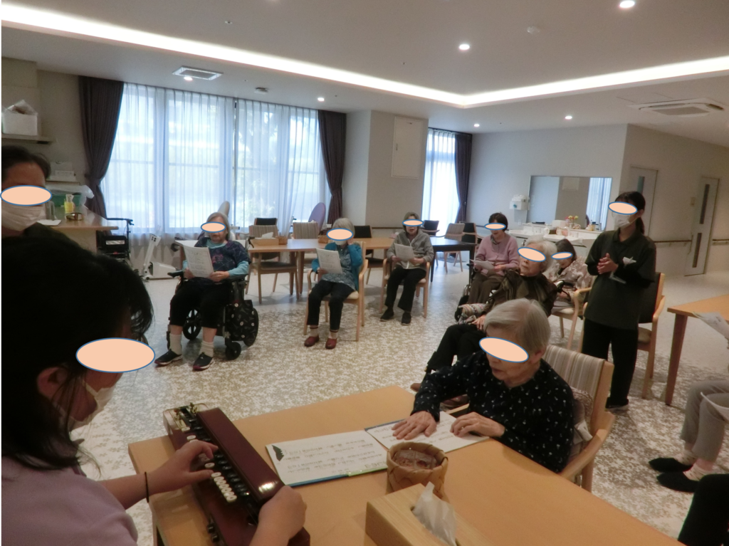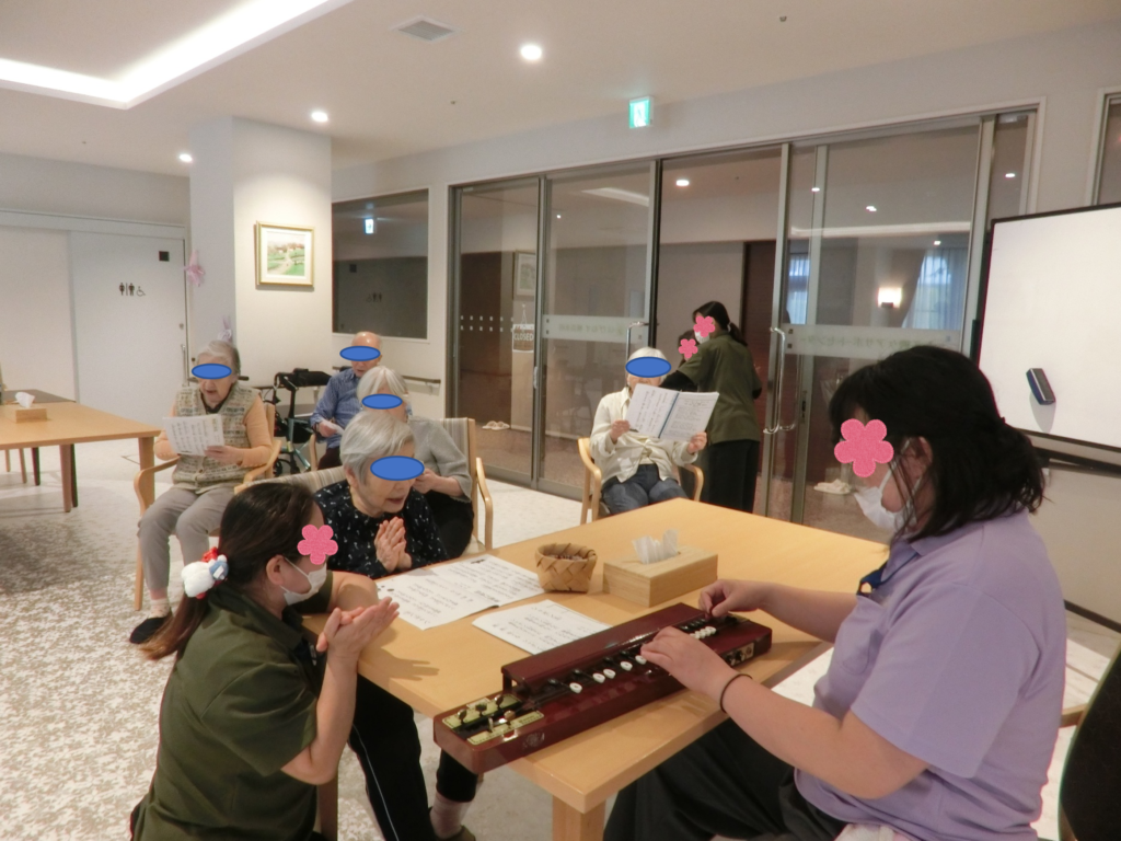 大正琴は大正元年に考案された日本生まれの和洋折衷楽器と言われ、木製の箱に5本程度の金属弦がついていて、タイプライターのように押して奏でるそうです。職員がおばあちゃまより譲受けた大正琴を演奏し、ノスタルジックな音色に合わせて、「ふじの山」「シャボン玉」「しょうじょうじのたぬきばやし」「赤い靴」など皆さん手をたたき懐かしそうに歌われていらっしゃいました。